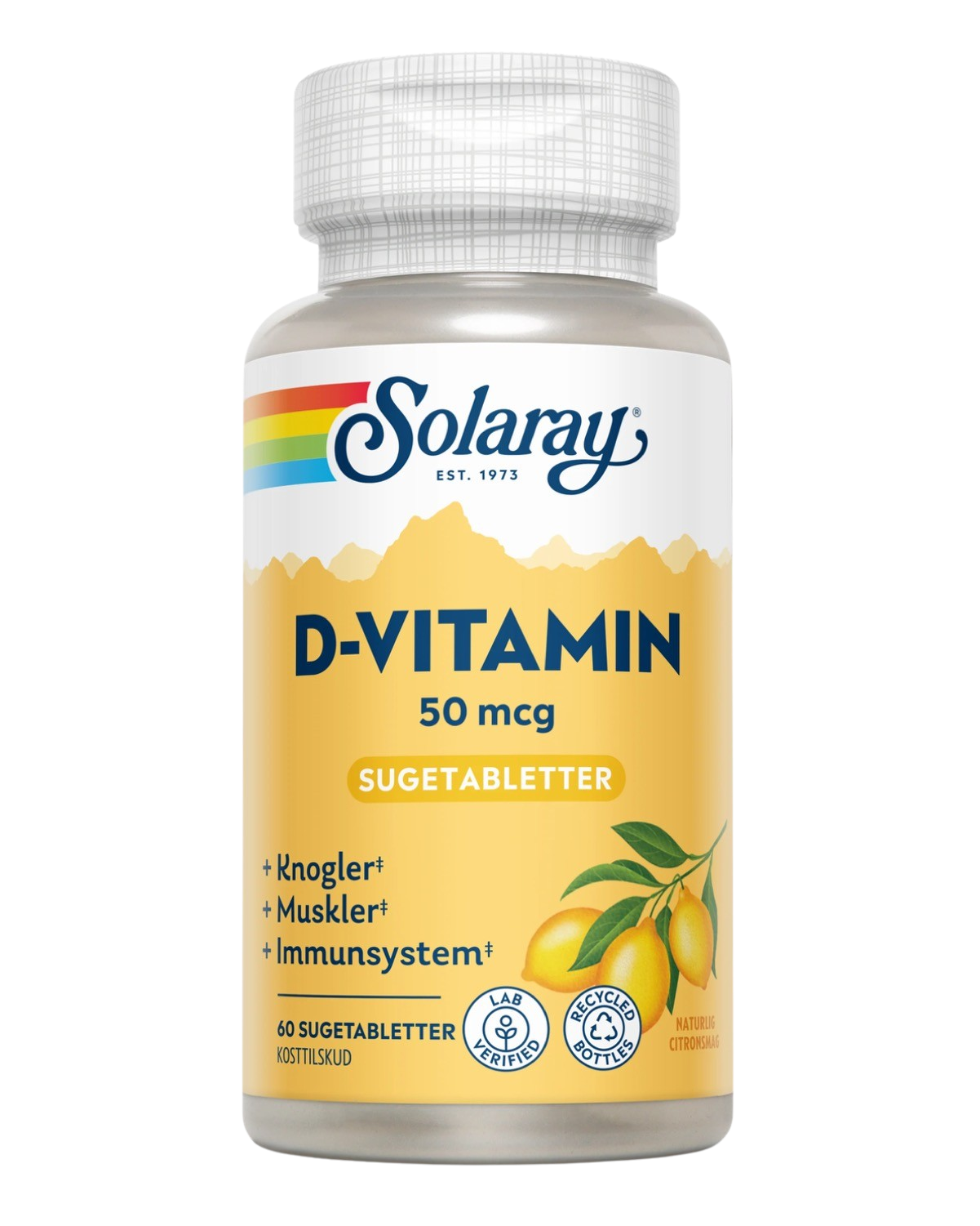 Solaray D-Vitamin 50 mcg er et kosttilskud i form af sugetabletter, der bidrager til at vedligeholde normale knogler og tænder, understøtter immunsystemets normale funktion og fremmer en normal muskelfunktion. Hver sugetablet indeholder 50 mikrogram vitamin D3 (cholecalciferol fra lanolin), svarende til 1000 % af det daglige referenceindtag (RI).