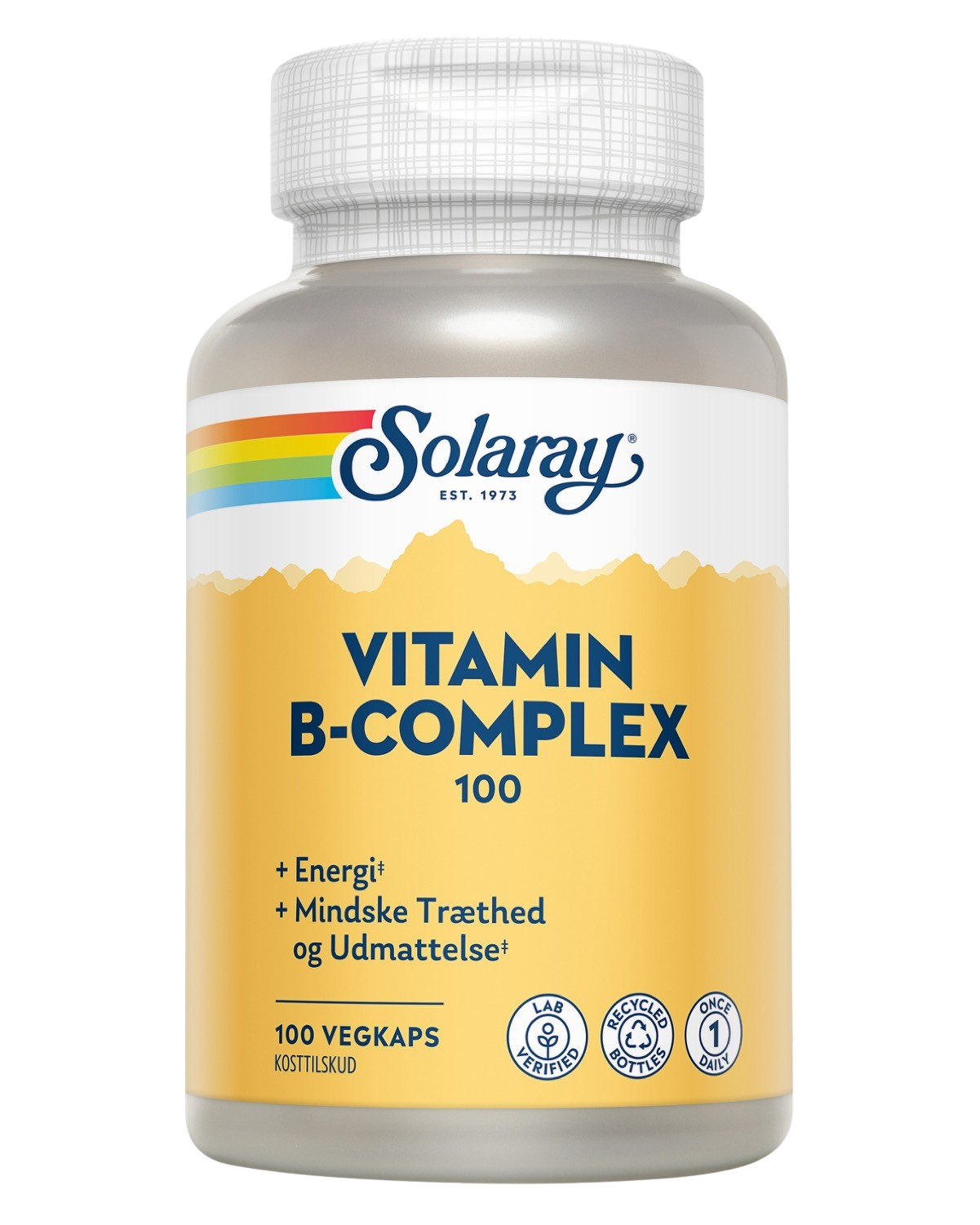 Solaray Vitamin B-Complex 100 er et kosttilskud, der indeholder alle otte essentielle B-vitaminer i høje doser – hver 100 mg per kapsel. Denne formel understøtter energi, nervesystem, immunsystem og dannelse af røde blodlegemer. Den indeholder også folat (400 mcg), biotin, pantothensyre, PABA, choline og inositol for yderligere støtte til nervesystemet.